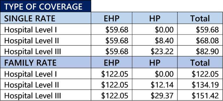 The Hospital Provision (HP) rates are based on plan experience by each level of coverage. The HP rates are adjusted to take into account the change in the number of retired members enrolled in Hospital Level II and III and the use of benefits.